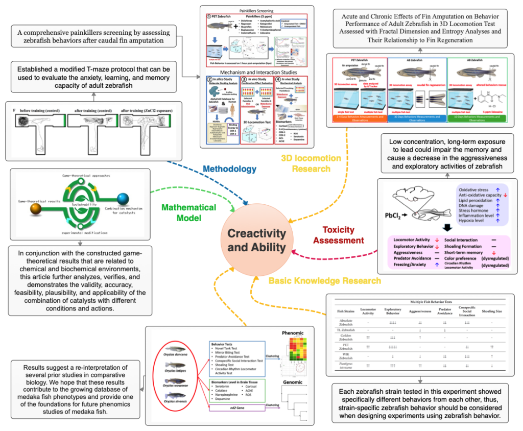 生態毒性是可能導致生態系統潛在危害的物質或物理因素。生態毒性研究是探討污染物對生物體的影響及其在環境中的相互作用,包括化學品、輻射或其他污染物對植物、動物和其他生物體以及它們賴以生存的生態系統的影響。生態毒性會導致各種不利影響,例如生物多樣性減少、繁殖障礙、生理損傷和生物死亡,並最終可能對整個生態系統產生深遠影響。本實驗室的研究主題之一是使用生化分析、分子生物學技術和多個評估終點來評估化學品、物理條件或新興材料的環境生態毒性,使用水生動物(斑馬魚和水蚤)作為評估平台來進行不同的測試實驗。本實驗室採用 Zebrabox 儀器篩選評估生態毒性,實驗過程包括樣品準備、準備斑馬魚胚胎、添加測試物質、監測胚胎活動和結果分析。我們同時採用神經行為學和生化方法對斑馬魚和水蚤中出現的污染物進行生態毒性評估,藉由從臨界游泳速度、新魚缸探索測試 、鏡咬、掠食者迴避、社群互動、群游、顏色偏好、晝夜節律、短期記憶測試以及三維 (3D) 游泳行為測量中獲得的多個行為終點數據,並結合生化分析,可以評估新興污染物的生態毒性。